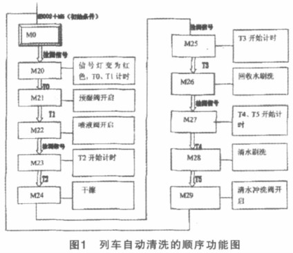 该列车主要是采用清洗机固定与列车自行牵引的通过式刷洗。具体来说,以一定的速度通过洗车区段,自动进行列车两侧的刷洗和冲洗。列车通过清洗区时,系统检测到有信号,并传给PLC,PLC则控制相应执行器完成相应动作。