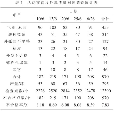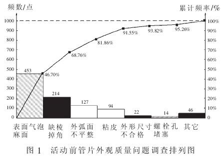 (2)活动开展前气泡麻面和缺棱掉角是影响外观质量的主要问题,两项不合格点有 667 个,占总不合格点的 68.76%。 开展 QC 小组活动后,气泡麻面和缺棱掉角问题明显降低,两项不合格点 20 个, 仅占到不合格点数的 8.85%,已不是外观质量问题的主要影响因素。