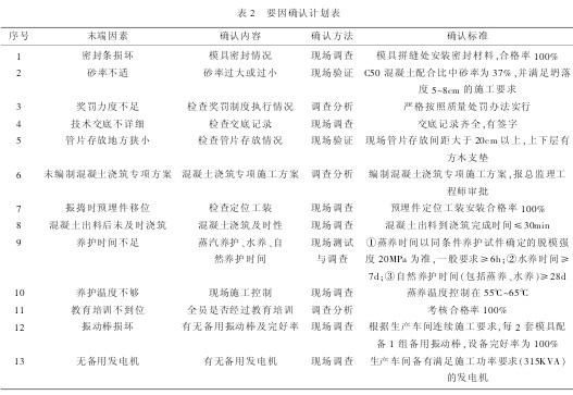 QC 活动小组针对管片表面气泡麻面和缺棱掉角现象进行了深入调查分析,并组织召开两次专题研讨会,广泛收集各方意见,集思广益,根据“5M1E”原则找到 13 个末端因素, 并制定了要因确认计划表,见表 2。