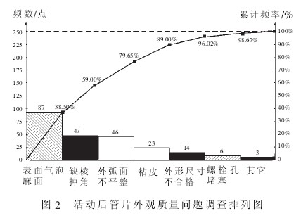 从调查统计表和排列图中可以看出,管片表面气泡麻面和缺棱掉角两项占到不合格率的 68.76%,是影响管片外观质量的主要问题。
