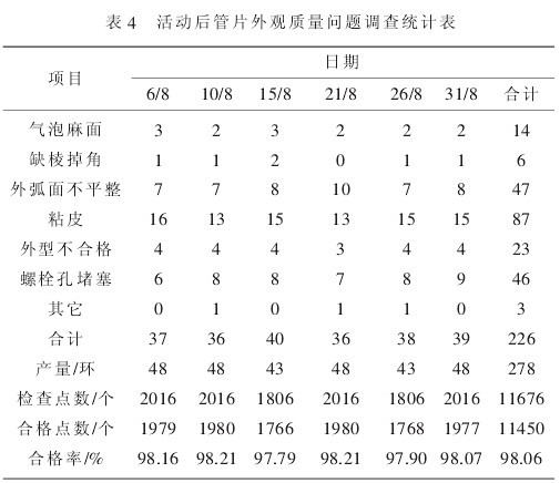 为验证 QC 小组活动质量成效, 小组成员于 9月 30 日随机抽取了 8 月份生产的 278 环管片,并采用与 6 月份相同的检测标准和方法对规范要求的外观质量 7 项“主控和一般项目”进行了逐一检查,按 42 点/环,共检查 11676 个点。 活动后管片外观质量问题调查统计表、排列图分别见表 4 和图 2。