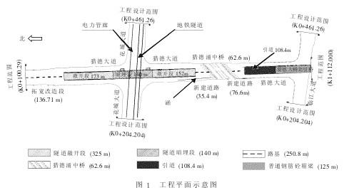 隧道在K0+477.805~K0+526.553段跨越位于花城大道正下方已全线贯通的地铁五号线。该地铁隧道左右线间距13m,直径6m,采用盾构法施工,呈东西走向。地铁隧道顶部标高为-2.68m,离花城大道隧道底部标高最小距离只有3.0m。因此,施工中如何确保地铁隧道的安全是本工程施工中的重难点,是本项目施工成败的关键。