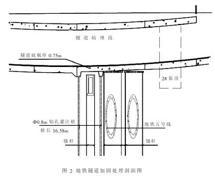 (3)施工中采用震动小的回旋钻机施作围护桩,最大限度地减小施工震动对地铁隧道的影响。两侧基坑采用冲击钻机成孔,采用泥浆护壁、灌注水下砼成桩,并采取从地面直接施作基底加固和支承桩的方法来避免施工废水对基底的浸泡。
