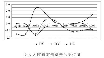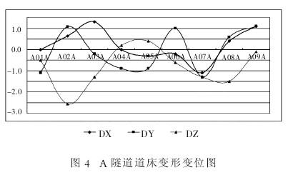 (1) A隧道道床上Y方向变形最大的监测点为A07A ,向地铁隧道方向内累计变形量为- 1.3 mm; Z方向变形最大的监测点为A02A,累计变形量为-2.6mm (沉降),变形最小的监测点为A05A,累计变形量为0.4mm (上浮),两点之间最大差异沉降为3.0mm。
