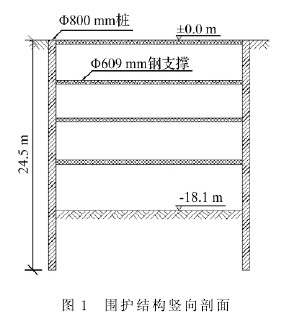 西三旗站是北京地铁8号线二期工程的第三座车站,位于西三旗路和西三旗东路十字路口处,在西三旗东路下南北向布置,为明挖施工地下两层岛式车站,车站结构覆土厚度约4.2m。基坑长211.7m,宽20.7 m,深度约18.1 m。车站主体结构采用Ф800@1400的钻孔灌注桩,盾构扩大端采用Ф800@1200的钻孔灌注桩,桩 长24.5 m。桩间采用挂Ф8@200×200mm的钢筋网并喷射150mm厚的C20混凝土,以保持桩间土体稳定。内支撑采用Ф609的钢管支撑,沿竖向设4道横向支撑,具体围护结构如图1所示。