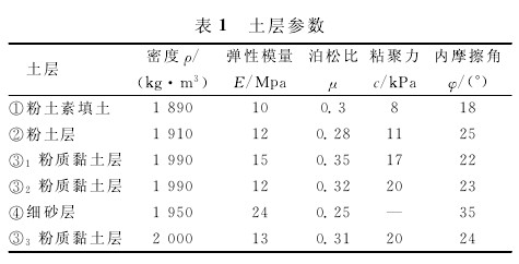 根据勘察报告,基坑开挖及灌注桩施工涉及的由上而下25m覆盖土层为:①粉土素填土层,以粉土为主,含少量碎砖屑,植物根等,结构松散,无层理;②粉土层,稍密~中密,含氧化铁、云母等;③1粉质黏土层,可塑,含氧化铁,少量有机质等;③2粉质黏土层,可塑;④细砂层,主要矿物成分为石英、长石、云母;③3粉质黏土层,可塑。具体土层参数见表1。