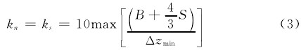式中:E为弹性模量,μ为泊松比。为保证桩体与土体之间的相互作用力传递,需创建接触面。接触面的主要计算参数为法向刚度Kn、切向刚度Ks、摩擦角φ以及粘聚力c。根据工程实例,灌注桩与土体接触面上的摩擦角φ以及粘聚力c可取与桩相邻土层的0.8倍。其中法向刚度Kn和切向刚度Ks可取周围“最硬”相邻区域的等效刚度的10倍,即: