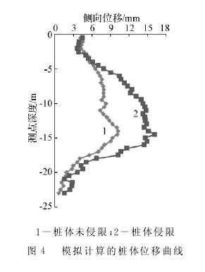 图4所示的两条曲线分别为基坑开挖完成后KZ-154号桩在侵限和不侵限两种情况下的模拟桩体位移。可以看出:1)无论是否侵限,围护桩的侧向位移曲线沿桩深均呈弓形分布,桩顶部和底部位移较小,桩体中部侧向位移较大;2)桩体在不侵限状态下开挖完成后的最大侧向位移为10.23mm,位于-14m处;3)在桩体下部实际侵限最大达80%的情况下,桩体侧向位移自-7.5m处开始明显增大,随着基坑的进一步开挖,最 大侧向位移发生于-14.5m处,其值达16.2mm,比未侵限时增大了58.3%;由于-14~-18m部位大部分侵限桩体被凿除,造成侧向位移普遍比未侵限状态下增大约40%;4)由于基坑深-18.1m,开挖完成后桩体下部尚有6.4m埋深,土体应力未曾释放,侧向位移自-18m开始急剧减小。