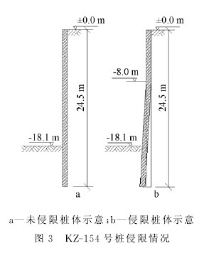 在实际工程中,KZ-154号围护桩侵限情况最为严重,因此选其作为分析对象。图3a为桩体未侵限示意,图3b为实际桩体的侵限状态示意。分别对此两种情况进行模拟分析。