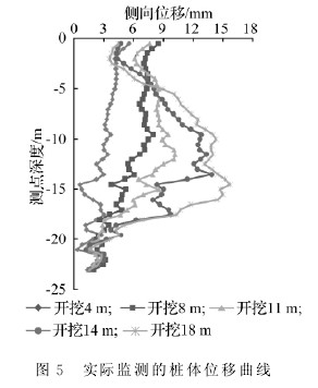 KZ-154号围护桩侧向位移现场监测曲线如图5所 示。选取桩体开挖至-4,-8,-11,-14,-18m时的监测数据进行分析。