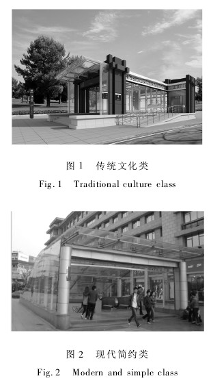 西安地铁三号线是西安市从西南到东北的主干线,贯穿了新兴经济开发区与老城区,穿越了西安的现代与古老文明,地铁站点出入口的建筑方案应紧密联系西安的历史文化元素,体现一个文明、开放、现代与充满活力的西安形象。在老城区域内,建筑形式以传统建筑风格为主,展现古城特色,别具一格; 在新城区,城市规划以现代建筑为主,展现出西安的现代化进程。根据西安的城市特点,地铁出入口的设计分为传统文化类和现代简约类。在西安现代建筑集中区域采用传统文化类出入口,强调地铁出入口的地域特点( 如图 1) ; 在传统文化区,采用现代简约类的出入口风格,体现传统中的现代高科技理念( 如图 2) ; 在城市广场区域,采用敞开式出入口,融于广场之中,不破坏广场的完整性。