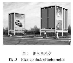 1) 独立高风亭。 周边没有足够的绿化围合空间时,采用出地面高风亭,高风亭体量大,造型处理难度较大,可处理成城市雕塑,或结合垂直绿化、广告牌、候车亭等多种处理方式( 如图 3) 。
