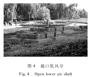 2) 敞口低风亭。 低风亭对城市景观的影响较小,是目前大多城市推荐采用的形式,但要求风亭周边有一定宽度的绿化围护距离( 如图 4) 。