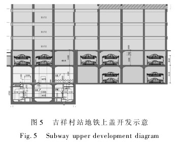 2) 在商业中心,车站主体进入道路红线以外的地块内,利用车站顶板上的覆土层设置地下停车库,在地面以上设计四到五层的商业空间,该商业空间与地铁站厅空间连通。此种模式创造的商业空间较大,由于位于商业中心区,商业价值较高,是“地铁+ 商业”双赢的一个代表,如吉祥村站就采用这种开发模式如图 5。