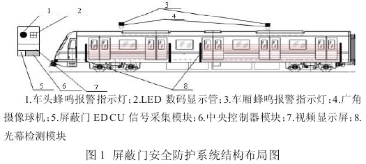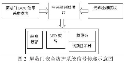 屏蔽门安全防护系统由信号采集单元、中央控制模块和状态显示模块三个部分组成。信号采集单元包括光幕传感器和屏蔽门 DCU信号采集模块两个部分,该部分将光幕传感器的遮断信号和屏蔽门本身的障碍物探测信号一同传输至中央控制模块,供其进行逻辑判断,然后将结果输出到状态显示模块。状态显示模块包含司机站立区的蜂鸣报警指示灯、LED数码显示管和视频显示屏,以及车厢上光幕传感器对应区域的摄像头和车厢蜂鸣报警指示灯。系统结构如图 1 所示。