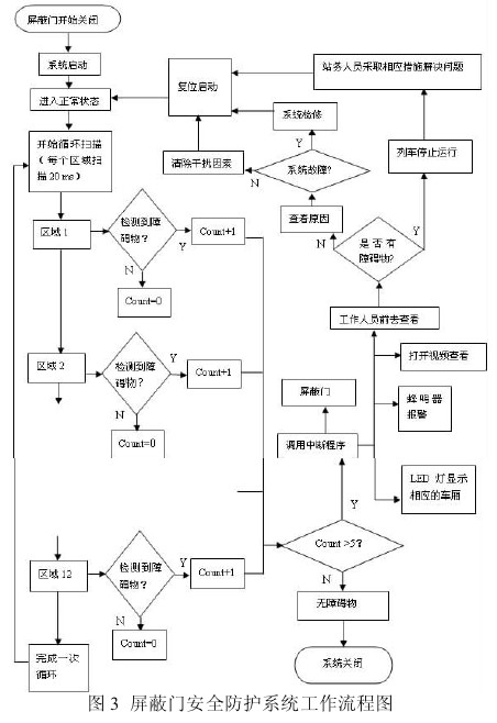 (1)疑似夹人情况判断。屏蔽门与列车门联动关闭时,系统开始启动扫描程序。例如对于六节编组列车,中央控制器模块接收到 12 个位置点的状态信号,若设定每 20ms 扫描一次,则一整列车扫描一次为 240ms,光幕传感器和屏蔽门 DCU 信号形成“与”的关系,即二者其中之一有信号,则认为发生了相应区域的夹人情况。当系统循环完毕后,考查总的计数值“Count”满设定参考值时,则认为探测到障碍物,此时启动司机站立区和车厢相应区域的蜂鸣报警指示灯,并使 LED 数码管显示相应的车厢代号及区域,例如第五节车厢一位端有夹人情况发生,则 LED数码显示管 2 将显示“51”。