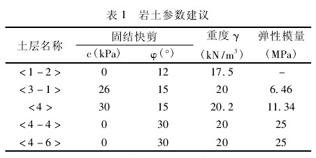 横通道从上到下地层依次为素填土 < 1 - 2 > 、粉质黏土 <3 -1 > 、黏土 <3 > 、中粗砂 <4 > 、黏土< 4 - 1 > 、粉质黏土 < 4 > 、中粗砂 < 4 - 4 > 和粉质黏土 <6 > 层。通道拱顶部主要为中粗砂 < 4 - 4 >层,底板埋置地层为中粗砂 < 4 - 4 > 层。横通道需降水施工,根据地质情况,横通道拱顶处于中粗砂层,易坍塌,需进行超前支护注浆,浆液采用改性水玻璃。地层围岩为Ⅵ级,具体土层参数见表 1。