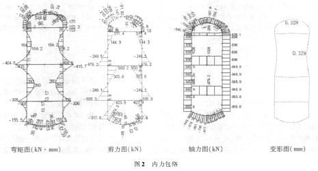 结构计算采用 SAP 软件进行计算,荷载 - 结构模型,二衬结构拱、边墙均用梁单元进行模拟,土层与结构接触用弹簧单元模拟。根据《铁路隧道设计规范》,拱顶荷载取全部覆土自重。