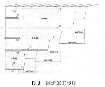 本横通道分上、中、下三个导洞施工,每个导洞均采用台阶法施工。上导洞台阶分界处增设临时仰拱,台阶之间的纵向距离 3 ~5m,导洞之间的纵向距离 5 ~8m。横通道施工步序,如图 3 所示。