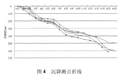 主要针对地表沉降监测进行论述,隧道拱顶地表布 置了 6 个沉降测点,测点最大沉降值约61. 6mm,最大沉降速率 0. 8mm / d,如图 4 所示。横通道地表测点最大沉降速率满足要求,但最大沉降值较大,分析沉降较大原因主要有以下几点: