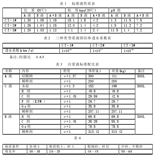 施工时根据地层情况配制溶液型或悬浊型浆液;通过调节浆液配比和注浆压力来控制浆液的凝结时间和注入范围。溶液型或悬浊型浆液均采用双液浆,其配比如表3所示,其中A、B双液组成溶液型浆液,A,C双液组成悬浊型浆液。悬浊型浆液以水泥为主,掺加注入性强的添加剂,适用于软弱粘性土、松散砂层、砂砾石层的裂隙的填充。溶液型浆液以水玻璃为主,掺加注入性强的添加剂,适用于密实的砂层、砂砾石层改良的后处理等。浆液中的添加剂一方面改良浆液,增强浆液的注入性;另一方面降低浆液凝固后的收缩性,确保注浆和止水效果。针对不同的地层,注浆时可先进行限制性注浆,浆液凝结速度快,可根据凝结时间确定注浆范围。然后进行渗透注浆,使浆液在地层中分布均匀。限制性注浆和渗透注浆可以自由切换,从而适用于各种复杂的地层。