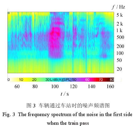 由图3可以看出,在50 Hz以下频带噪声值大小较为均匀,而且数值较小。噪声源的主要频带为200~4 000 Hz。在 50~100 s 时间段内,为车辆进站过程,等效声级为81.5 dB(A)。90~100 s时间段内噪声值明显变大,出现车辆通过站台时的噪声峰值,大小为85.3 dB(A)。在120~140 s之间图中显示有两条贯穿低频和中高频带的深色线,为车门开关时产生的噪声,等效声级为74.4 dB(A)。在150~160 s时,车辆开始离开站台,等效声级为73.5 dB(A)。可以看出车辆进站时的噪声值远高于车辆离站时的噪声值,分析其原因主要是由于车辆进站时,每辆地铁车辆都经过驶入端的测点,直到静止轮轨噪声的声源始终存在,而车辆出站时,速度是从0逐渐加快,当列车具备一定速度时,声源已距离测点较远,因此测得噪声值相对较小。