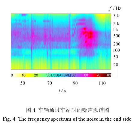 由图4可以看出,与驶入端测试一样,在50 Hz以下频带噪声值较小且均匀,主要噪声频带为200~4 000 Hz,即为轮轨噪声频带。但从时域变化上分析,40~80 s时间段内,为车辆进站过程,等效声级为75.6 dB(A),主要频带为 200~2 000 Hz 左右。在 70~90 s 内贯穿低频的深色线为车门开关时的噪声情况,等效声级为74.9 dB(A)。在90~110 s时车辆离站,等效声级为80.1 dB(A),此时间段内噪声值明显变大,出现车辆通过站台时的噪声峰值,峰值大小为83.3 dB(A)。可以看出车辆进站、出站测得结果与驶入端测得数据大小刚好相反。分析其原因主要是由于车辆进站时车辆轮轨噪声源是逐渐靠近测试点,当车辆靠近测试点时,车辆速度已经接近为0。而车辆出站时,每辆列车都经过测试点,轮轨噪声源和在驶入端测试车辆进站阶段一样始终存在,因此噪声较车辆进站时要大。