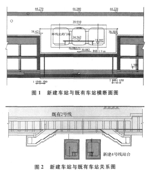 某新建地铁站下穿既有地铁车站,两地铁线采用站厅—站台“十”字换乘方式,既有车站为岛式站,新建车站为侧式站。新建车站两端双层,中间单层,车站总长度 197. 3 m,总宽度 24. 4 m,站台宽度14 m,中间单层为 14 m 岛式暗挖段为本论文的研究对象,两者垂直交叠净距仅为 1. 90 m,新建车站与既有站关系见图 1、图 2。