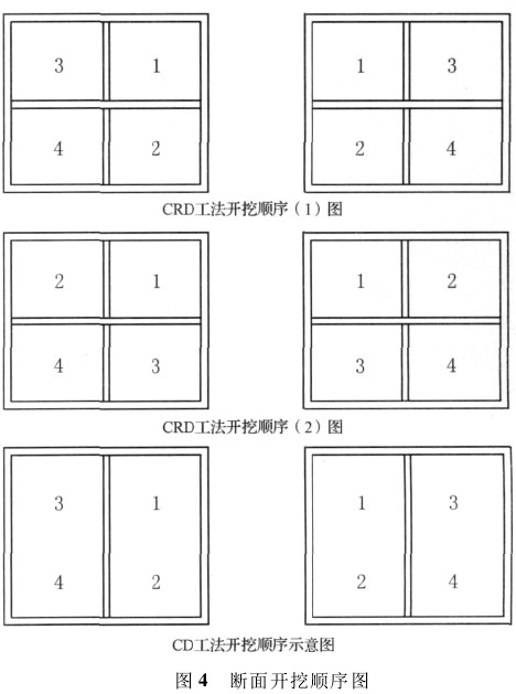 ( 2) 开挖顺序: 采用 CD 法、CRD 法分步开挖施工时,必然会涉及到开挖顺序问题,不同的开挖顺序会导致不同的地层变位沉降,将单洞结构断面分为四部分,可形成按照图 4 三种顺序的开挖方式。