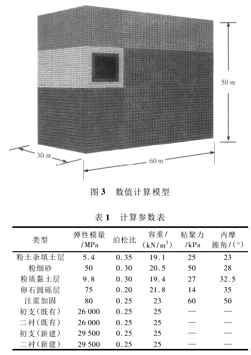 为了避免既有结构的不均匀受力和不均匀沉降,双线车站隧道采取平行对称施工,因此,数值建模采取对称模型,同时根据圣维南原理,考虑到边界效应的影响,确定计算模型沿既有线方向( Y 轴) 的长度取 60 m,宽( X 轴) 30 m,向下取至地面以下( Z轴) 50 m,计算模型见图 3。本构采用弹塑性模型,便捷采用位移边界条件,岩土计算参数见表 1。