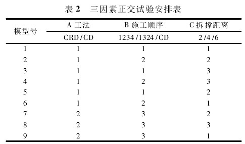 考虑以上三种因素,根据正交试验的设计理论,组合九种施工方案,建立三因素正交实验,三因素正交实验表见表 2。