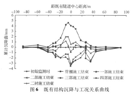 ( 3) 拆撑距离。由于车站施工中,施做二衬时需对初期支护的临时支撑、中隔墙及仰拱进行拆除,必然会引起既有结构的沉降,本分析根据经验,采用2、4、6 m 进行组合分析。