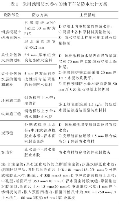 在地下车站中,预铺防水卷材主要用于采用“外防内贴”法铺设防水层的结构底板和侧墙。采用预铺防水卷材的地下车站防水设计方案见表 1。