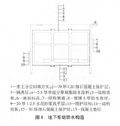 1)图 1 为地下车站防水构造,明挖车站的侧墙和底板迎水面设置预铺防水卷材防水层,结构顶板迎水面设置单组分聚氨酯防水涂料防水层。