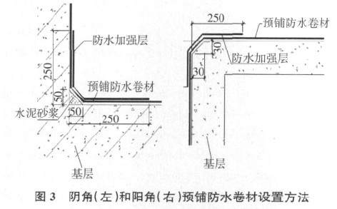 3)阴阳角部位增设防水加强层,防水加强层在防水层之后铺贴,即将防水加强层满粘在已经铺设完毕的防水层表面。图 3 为阴阳角部位预铺防水卷材设置示意图。