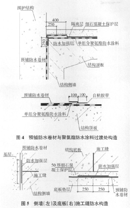 4) 侧墙防水卷材层和顶板单组分聚氨酯防水涂料层采用自粘过渡的方式,如出现空鼓、翘边、满粘等较差效果时,可对卷材粘合面进行适当加热后再粘贴,然后增设自粘胶带进行封边处理。图 4 为预铺防水卷材与单组分聚氨酯防水涂料过渡处构造。