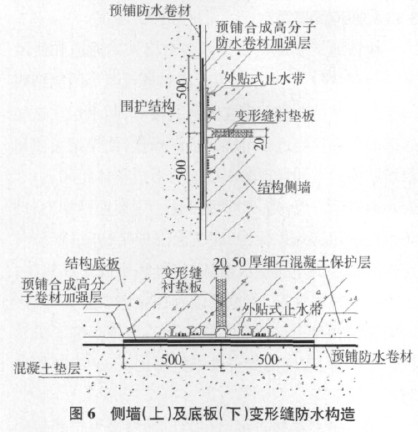 6) 变形缝部位设置延伸率不低于 300%的 1.5mm 厚合成高分子防水卷材(优先选用高分子自粘胶膜防水卷材)作为防水加强层,合成高分子防水卷材满粘在预铺防水卷材表面。图 6 为侧墙和底板变形缝处防水构造。应注意变形缝防水加强层表面不得浇筑细石混凝土保护层,以使加强层与现浇混凝土结构满粘。