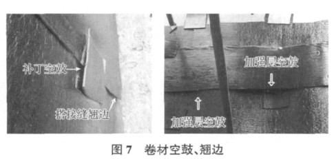 北京地铁 14 号线工程采用了双面自粘聚酯胎改性沥青防水卷材,卷材与卷材进行搭接以及加强层与防水层之间进行粘结时,卷材接触面的隔离膜均要求撕掉,使两层卷材的自粘面之间互相粘结,确保卷材之间的粘结强度和密贴性。但在现场实际操作过程中,即使采用了双面自粘卷材,其粘结质量也难以得到保证,出现大量翘边、空鼓现象(图 7),给现场施工带来很大的困难。