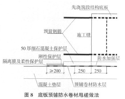 底板预铺防水卷材甩槎做法如下(图 8):1)根据确定的铺设范围预铺底板防水卷材,卷材端部应超过底板后续绑扎钢筋的端部至少 200 mm,该范围为卷材的甩槎范围,其余范围的卷材防水层撕掉表面隔离膜,经验收合格后及时浇筑细石混凝土保护层;2)甩槎卷材表面的隔离膜不得撕掉,然后覆盖一层柔性保护层,柔性保护层一般采用无纺布或 PE 泡沫塑料等;3)在甩槎柔性保护层表面覆盖刚性保护层,刚性保护层可采用木板或沙袋;4) 在进行防水层接槎前,去掉刚性保护层和柔性保护层,撕掉隔离膜,完成卷材的接槎。