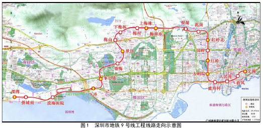 深圳市地铁9号线起于南山区深圳湾,经福田区,呈“几”字形,止于罗湖区文锦南路路口,设本线终点鹿丹村站。线路全长约为 25.45km,共设 22 座车站,全部为地下线路。地铁 9 号线工程是深圳市实现“南北贯通、东拓西联”、“中心强化、两翼伸展”空间发展策略、形成“三轴两带多中心”城市空间布局结构、缓解交通拥堵、实现城市综合交通和公共交通发展战略的骨干线路。鹿丹村站起于金塘街与滨河大道交叉口处,止于滨河大道与布吉河交汇处。鹿丹村站位置见 9 号线线路走向示意图(见图 1)。