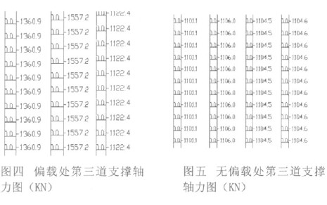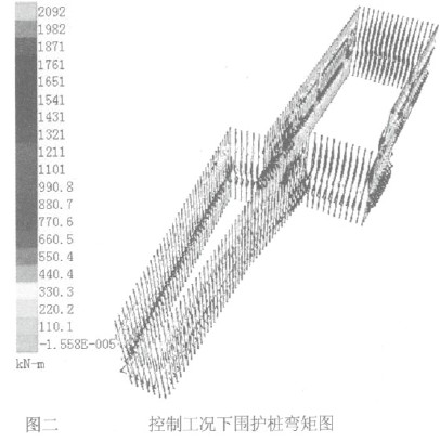 对围护桩分别考虑偏载侧和无偏载侧的受力状态,通过对比分析,得出偏载对围护桩受力的影响,通过计算对比分析围护桩的桩身配筋差异。围护桩受力情况如图二、图三。