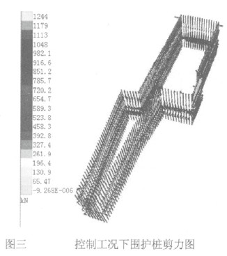 内支撑主要考虑控制工况下第三道支撑的轴力,轴力图如图四、图五: