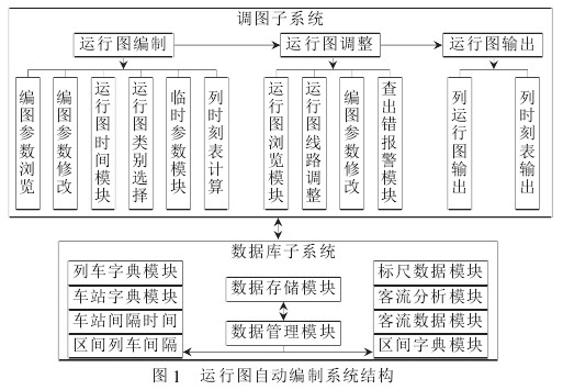 整个系统有两个主要组成部分:数据库子系统和运行图调图子系统。 其中数据库子系统包括数据管理和数据存储两个模块, 它是编图的基础又是编图的归属,负责存储、组织、管理整个排布系统的数据信息。调图子系统包括运行图自动编制、运行图调整、运行图输出模块,它是系统的核心部分。 根据地铁运营情况,通过求解模型中的函数,得到编制列车运行图的数据 ,自动 完成 列车运行图的排布并经人工介入调整后输出使用。 运行图自动编制系统结构如图 1 所示。