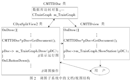 由于车站信息也是运行图的一部分 ,因此 ,两视图显示的位置必须一致,二者都依赖于文档类中的图形数据进行统一 。 m_TrainGraph 是一个CTrainGraph 类的对象,而 CTrainGraph 类封装了运行图的图形数据,并提供操作接口, 基本上所有的运行图操作都围绕该类进行。与 CMTTDDoc 类相关联的有 CMTTDview 类和CDynSplitView2类两个视图类, 后者用于运行图的显示和调图操作,而前者在与后者对应的位置显示车站和区间信息。OnLButtonDown () 等操作都必须做类似:CMTTDDoc*pDoc =GetDocument ( ) ; 的操作 , 最后通过 pDoc 进行操作。