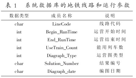由于地铁运行图的特点, 开发时采用微软的 Access作为平台,共分为三个数据库:系统数据库、基本数据库及结果数据库。 其中系统数据库包含了地铁线路表和运行参数表,如表 1 所示。 该表决定了排哪一条线路的运行图以及对该线路运行图的基本要求;基本数据库则可以存储该线路的所有参数 :车站 、股道 、道岔 、区间 、列车、上下行客流、车库、日行车计划等多个数据 字典 ;而结果数据库则保存了经过计算后该线路的旅客时刻表、查错记录表及质量指标表。