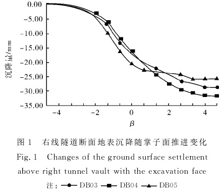 2011年11月1日建立测站DB03、DB04、DB05,随着隧道开挖掌子面逐渐逼近、达到、通过监测断面,地表沉降逐渐发展直至稳定;此后左线开挖,历时90天于2012年1月31日通过DB05监测站监测的地表最终稳定.其曲线如图1所示,当-4<β<-2时,各观测断面各监测点出现明显沉降,DB03最大沉降点位于右线隧道中心线正上方测点DB0304,量为4.67mm,约占总沉降量的16.6%,DB04最大沉降点位于右线隧道中心线正上方测点DB0404,量为3.43mm,约占总沉降量的10.8%,DB05最大沉降点位于右线隧道中心线正上方测点DB0504,量为4.04mm,约占总沉降量的15.7%;当-2<β<2时,各观测断面各监测点出现急剧沉降,DB03最大沉降点位于右线隧道中心线正上方测点DB0304,量为19.36mm,沉降速率可达0.89 mm/d,占 总 沉 降 量 的67.5%;DB04最大沉降点位于右线隧道中心线正上方测点DB0404,量为24.24mm,沉降速率可达0.84mm/d,占总沉降量的76.2%;DB05最大沉降点位于右线隧道中心线正上方测点DB0504,量为19.92mm,沉降速率可达0.93mm/d,占总沉降量的77.6%;当2<β<4时,各观测断面各监测点沉降变化速率开始减缓趋于稳定.