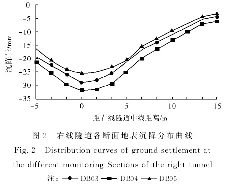 大连地铁202标段促春暗挖区间在掌子面前方50m布置监测断面,右线区间先开挖,左线滞后,根据右线隧道监测结果确定左线隧道开挖的时间.在右线区间单独开挖期间选择DB03、DB04和DB05等3个监测断面进行地表沉降分析,沉降曲线分布如图2所示,3个监测断面的最大沉降点在隧道中心线上方.由图2可知,DB03、DB04和DB05等右侧有建筑物群,故不能完全布置地表沉降点,该3个监测断面的地表沉降隧道中线基本呈半正态分布,变化趋势基本相同.