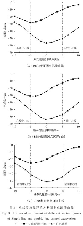 当右线隧道开挖引起地表沉降趋于稳定时,各断面最大沉降曲线见图3所示,DB03断面右线隧道中心线正上方最大沉降量为28.87 mm,DB04断面右线隧道中心线正上方最大沉降量为31.82mm,DB05断面右线隧道中心线正上方最大沉降量为25.66mm.左线隧道开始开挖后对已经稳定的隧道围岩产生新的扰动,但其影响程度与距离有关,距离越近,影响约为剧烈.当左线隧道掌子面通过各断面时最终沉降曲线如图3所示.DB03断面双线隧道中心线正上方最大沉降量为57.34mm,约为右线隧道开挖最大沉降量的1.99倍;隧道DB04断面隧道中心线正上方最大沉降量为64.86mm,约为右线隧道开挖最大沉降量的2.04倍;DB05断面隧道中心线正上方最大沉降量为51.76mm,约为右线隧道开挖最大沉降量的2.02倍.由此可见,双线隧道开挖较单线隧道开挖引起的地表沉降不仅位置发生了改变,而且最大沉降量也发生较大的改变,约为单线隧道开挖的1.99~2.04倍.