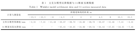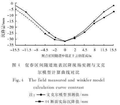 由式(3)计算的文克尔模型沉降数据如表1所列.由图4对比可知,实测数据曲线和文克尔计算模型曲线和沉降趋势吻合,文克尔计算数值较实际观测值偏小,仅应用文克尔地表沉降预测模型能够得出地表沉降的趋势,不能准确得出最大沉降量.这是由于在实际工程中隧道上方的土层为人工素填土且有少量的建筑垃圾,理论假设有了一定的差距;同时在理论计算时没有考虑到流-固耦合条件下土-结构的变形是否符合线弹性性质.由图4对比可知,实测数据曲线和文克尔计算模型曲线和沉降趋势吻合,文克尔计算数值较实际观测值偏小,仅应用文克尔地表沉降预测模型能够得出地表沉降的趋势,不能准确得出最大沉降量.这是由于在实际工程中隧道上方的土层为人工素填土且有少量的建筑垃圾,理论假设有了一定的差距;同时在理论计算时没有考虑到流-固耦合条件下土-结构的变形不符合线弹性性质.