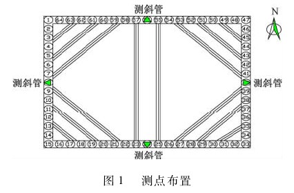 测斜管布置在基坑平面上挠曲计算值最大的位置,如悬臂式结构的长边中心,设置水平支撑结构的两道支撑之间。孔与孔之间布置间距宜为 20 ~50 m,每侧边布置 1 个监测点,如图 1 所示。